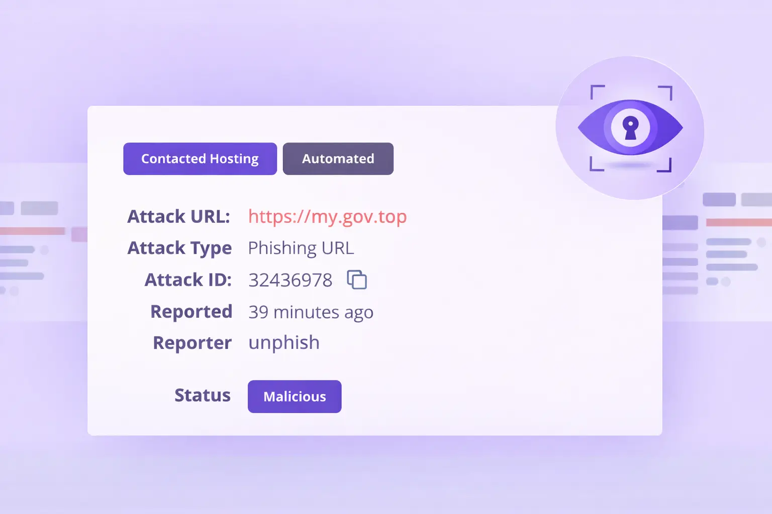 unphish continuously monitors malicious domains, impersonation accounts, and fraudulent applications. Integrated detection and enforcement workflows shorten exposure windows and help protect customers without increasing operational burden.