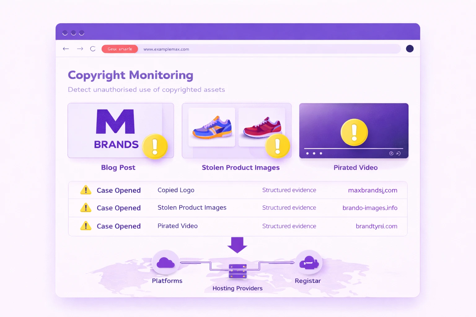 Detect and document unauthorised use of copyrighted assets, including logos, product imagery, video, and written content across digital channels. Structured evidence collection supports rapid enforcement action with platforms, hosting providers, and registrars, enabling swift removal of malicious or deceptive content and reducing ongoing reputational risk.