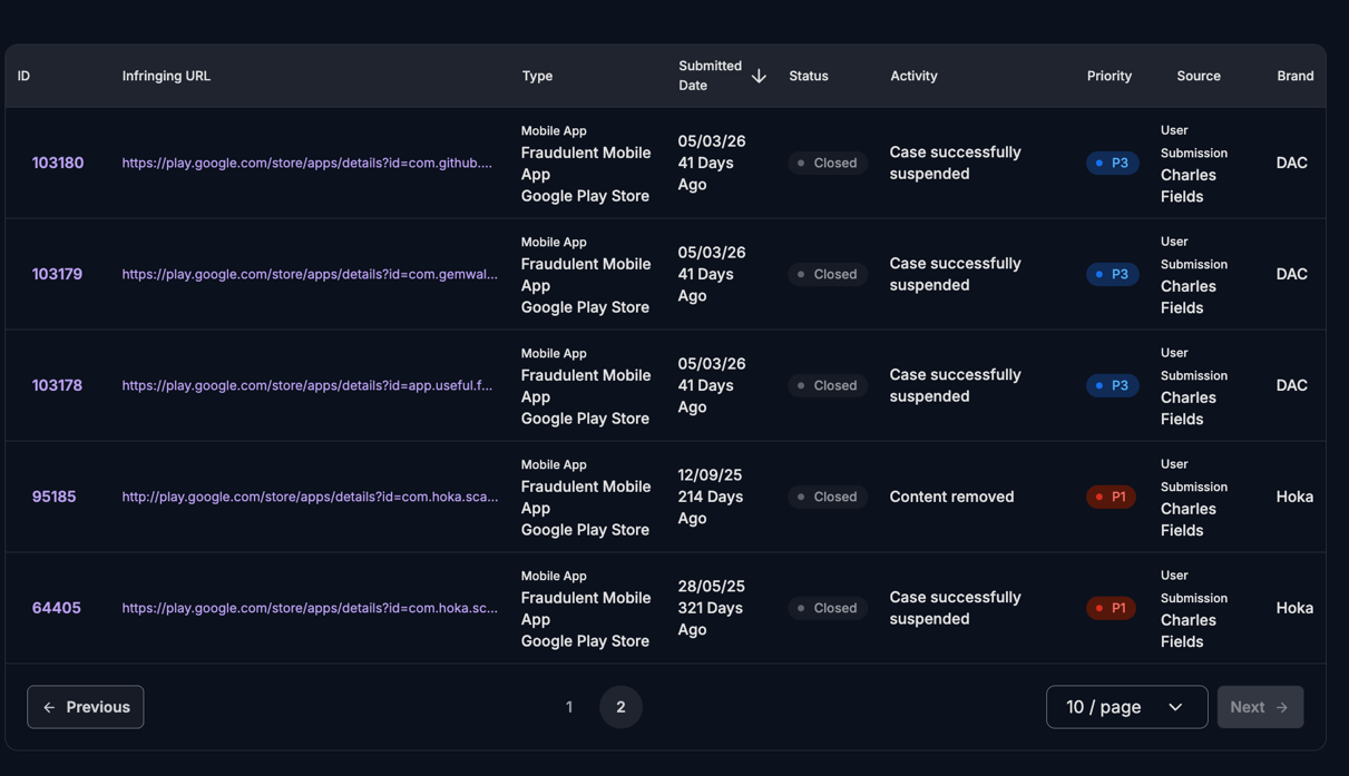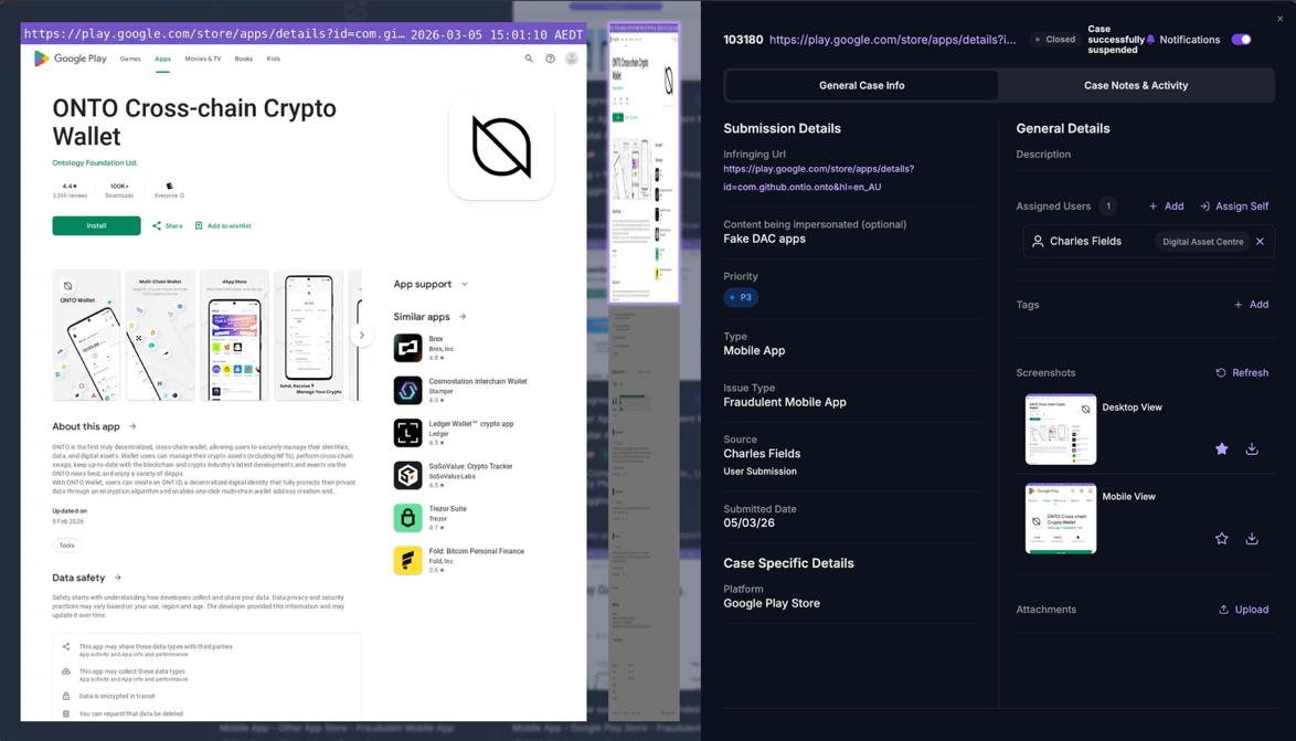 For each app identified, unphish automatically collects and preserves evidence, including app metadata, screenshots, descriptions, developer details, and linked infrastructure. This evidence supports efficient and defensible takedown requests aligned to app store policies.Enforcement actions include